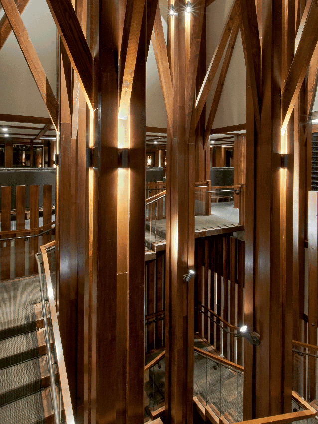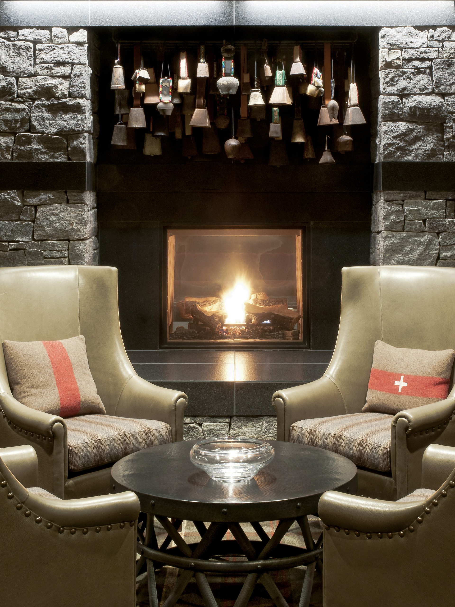 Designed by Bull Stockwell Allen with interior furnishing and finishes by Brayton & Hughes Studio, the new 20,000 square foot, Alpine Clubhouse represents Stowe resort’s ultimate members-only, ski-in/ski-out dining and recreation experience. The club occupies the first two levels of the “pinecone”, a pyramidal, five-story structure inspired by the geometry of its namesake. The club’s two levels are linked together at the center, via a grand stair with tall, tree-form columns that form a dramatic focal point for the dining room and bar. Designed to evoke a contemporary version of a New England Alehouse, the interiors feature a large native granite fireplace and warm wood paneling.
