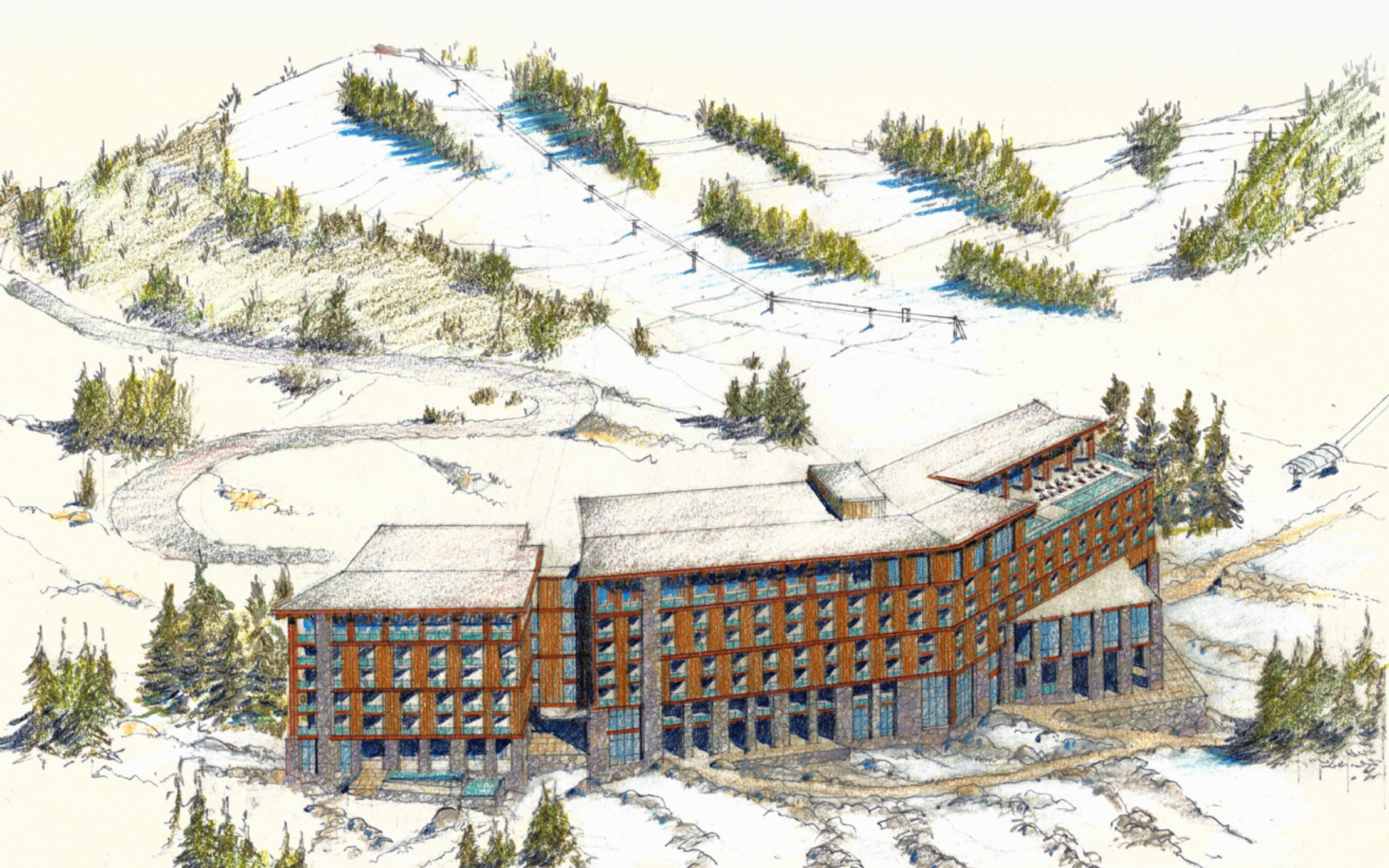 The Bear Valley Village Center will anchor a vibrant, contemporary four-season destination that combines technology with the next generation’s commitment to innovative design in harmony with the environment. The master plan includes a new village lift and over 1.6 million square feet of mixed-use, commercial, and residential development over underground parking. The village is designed to encourage pedestrian circulation in all seasons and weather. It is organized around a series of defined and usable public spaces that relate strongly to the natural environment and to each other. The combination of commercial and residential elements lining the pedestrian routes to the new ski lift will produce an animated and enjoyable experience for all users.