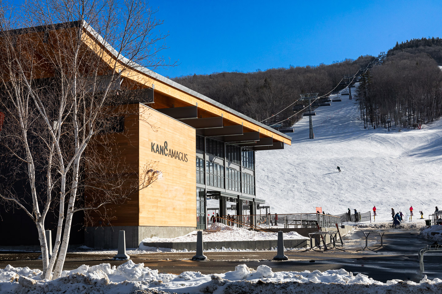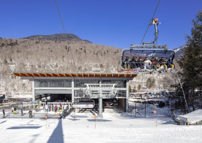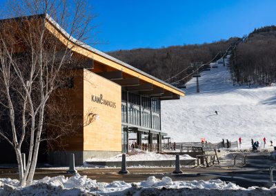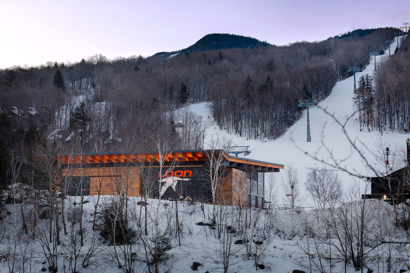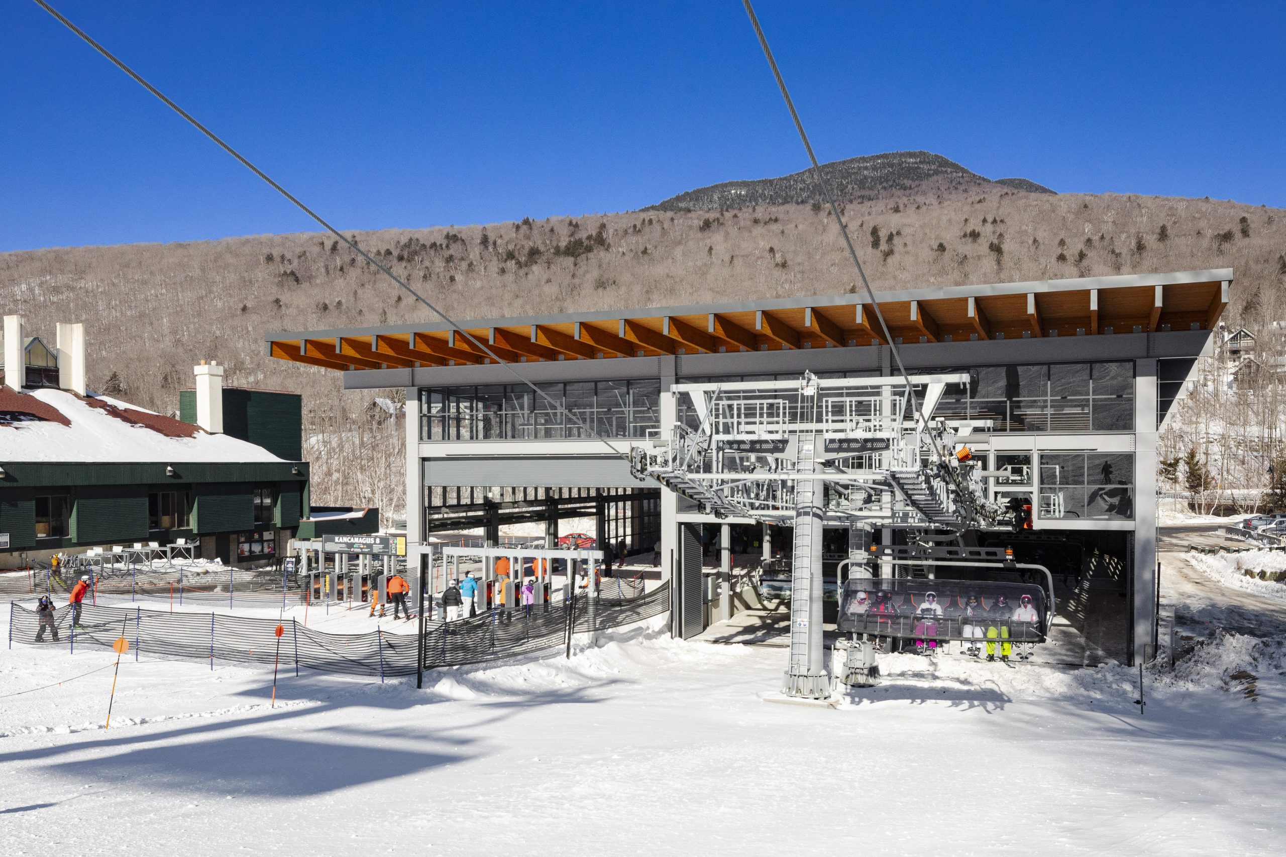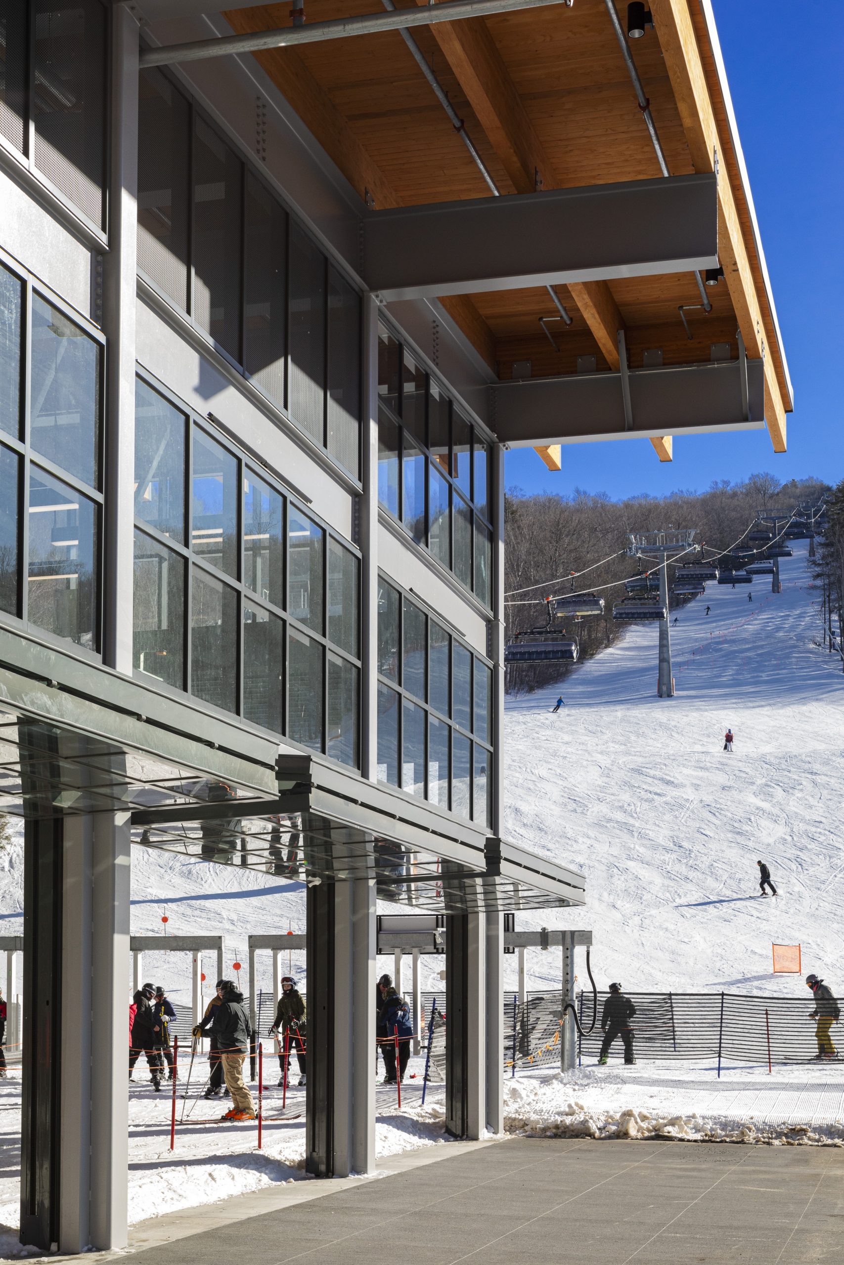 Bull Stockwell Allen designed a first-of-its-kind, semi-enclosed pavilion that wraps around the Kancamagus 8 lift at Loon Mountain Resort. North America’s most technologically advanced chair lift, Kanc8 is an eight-seat, D-Line Doppelmayr chair with ergonomically shaped heated seats and tinted bubble. Opening up to an adjacent plaza, the Kanc8 pavilion creates a multi-use assembly space that stretches its value beyond the winter and ski season for year-round utilization. Kanc8 will provide skiers a covered loading experience, protecting them from the elements in the winter, and a loading base for bikers in the summer months. This custom open-air structure is notably different from its predecessor in drastic and eye-catching ways; with versatility and high-performing functionality being a critical consideration in this design, aesthetics were upheld to just as high a priority and standard, resulting in this stunning structure that nestles perfectly and unobtrusively into, rather than on, the site.