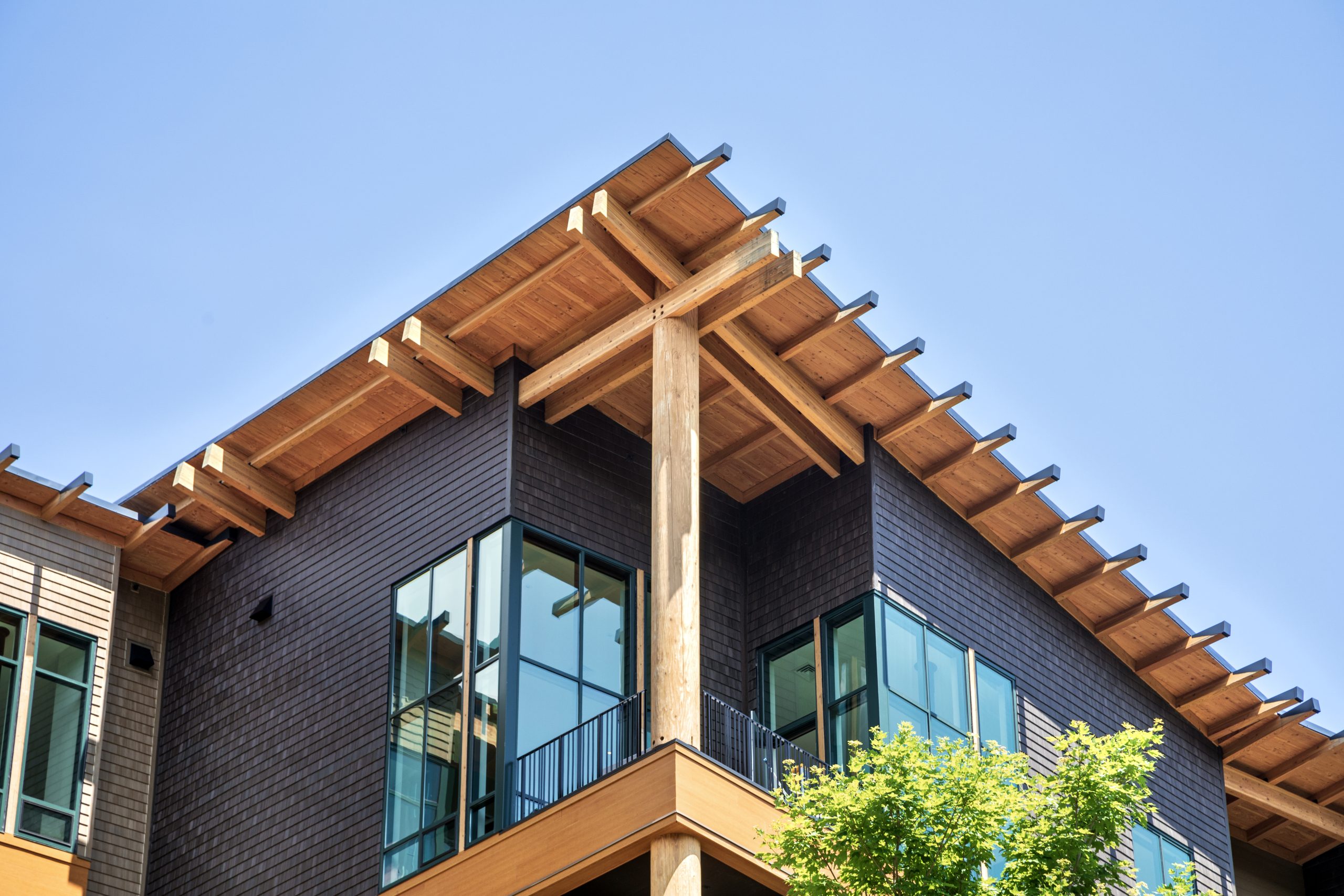 The Treehouse was designed to be part of the continuing evolution of a mountain village where its architecture is inspired by site, context and the natural environment. The structure boasts 48 residential condominium units over parking, drawing inspiration directly from its surroundings. It sits on a heavily wooded hillside site overlooking majestic mountains. A mature stand of trees provides a buffer to the adjacent highway while providing filtered views from the building to the landscape. Fitting of a building set in nature, signature design elements include stained shingles with a natural wood look, and heavy timber posts and beams inspired by the surrounding spruce, beech, maple, and birch trees. These tree-like forms are topped by canopies of heavy timber outriggers which break the façade and vary the eave height. The building is 100% electric and designed in accordance with energy conservation and preservation of the environment.